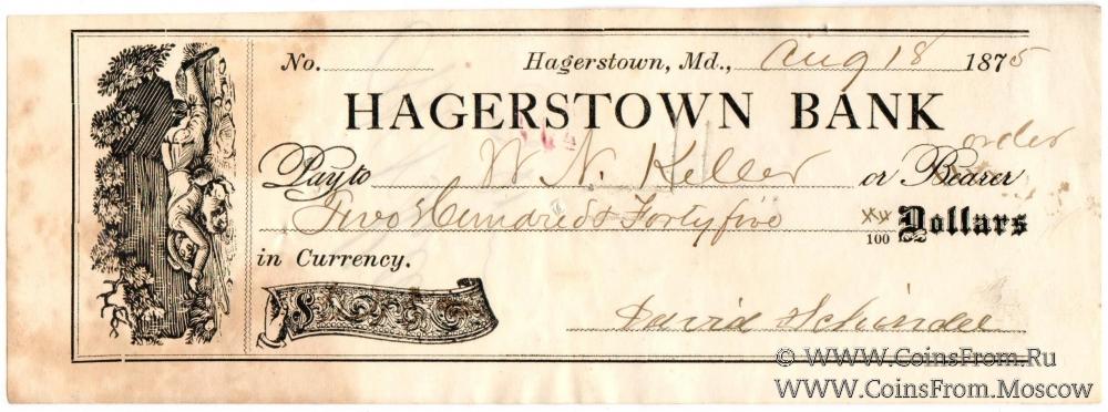 Банковский чек (погашен, оплачен). Без марки. Перфорация. Штампы. Подписи. Хейгерстаун Банк (Hagerstown Bank).