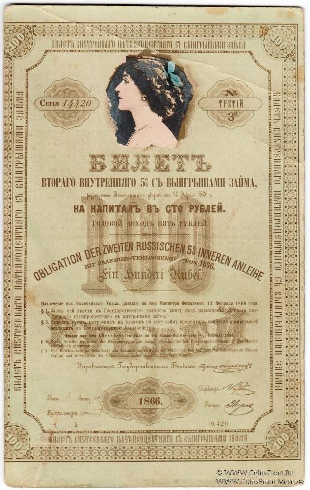 Открытка стилизована под Билет второго внутреннего 5% с выигрышами займа на капитал 100 рублей 1866 г. (Облигация), с изображение девушки (Лина Кавальери).