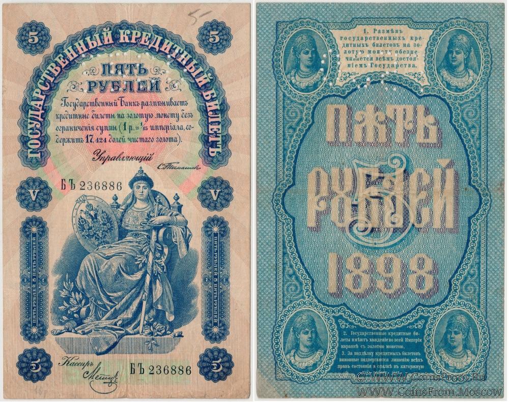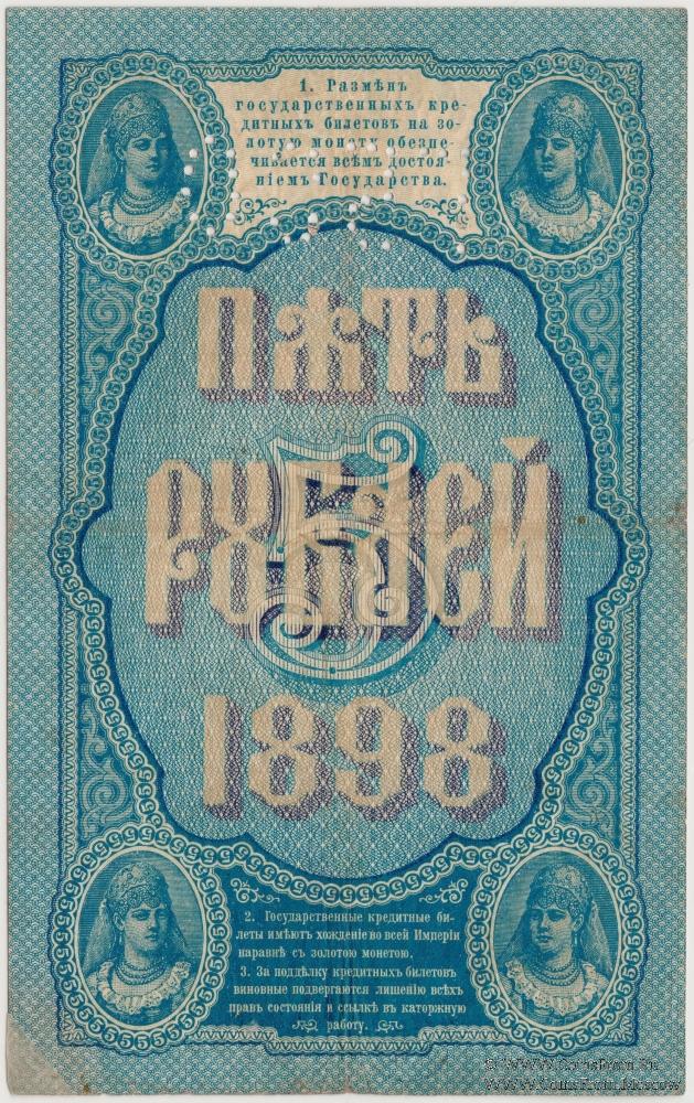 Перфорация ГБСО на государственном кредитном билете 5 рублей образца 1898 г. Данные билета: Серия БЪ (Серии БД - ДЬ). Управляющий - Тимашев С.И. Кассир - Метц. Государственный Банк. Экспедиция заготовления государственных бумаг (ЭЗГБ, Санкт-Петербург).