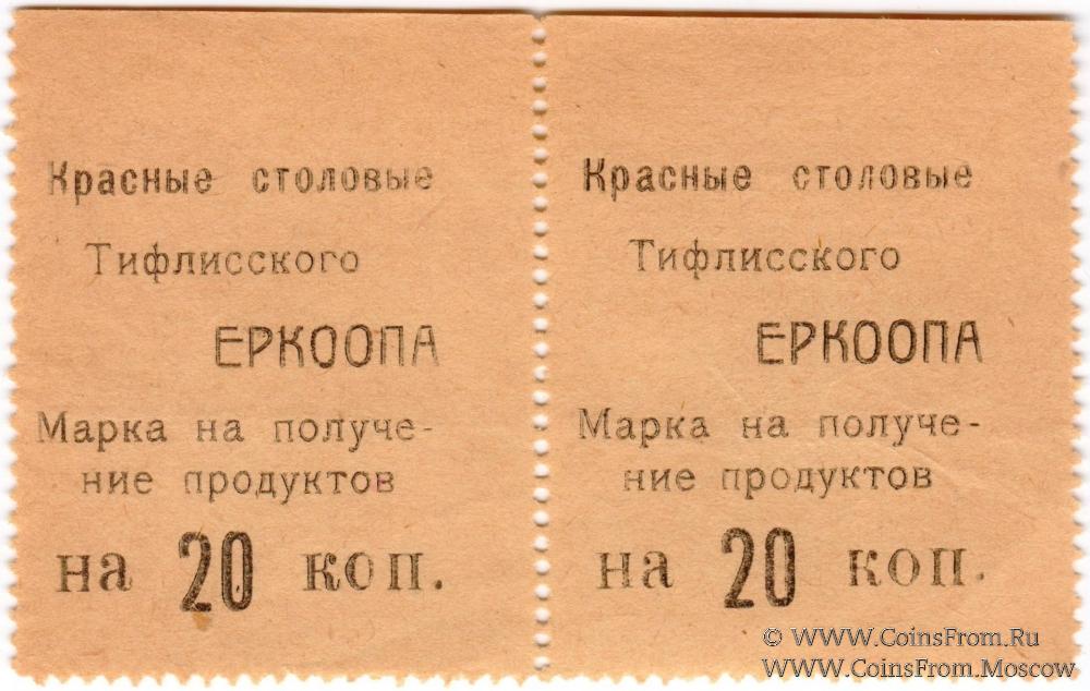 Марка на получение продуктов без даты. Бумага тёмная. Сцепка горизонтальная из 2 шт. Красные столовые Тифлиссого ЕРКООПа.