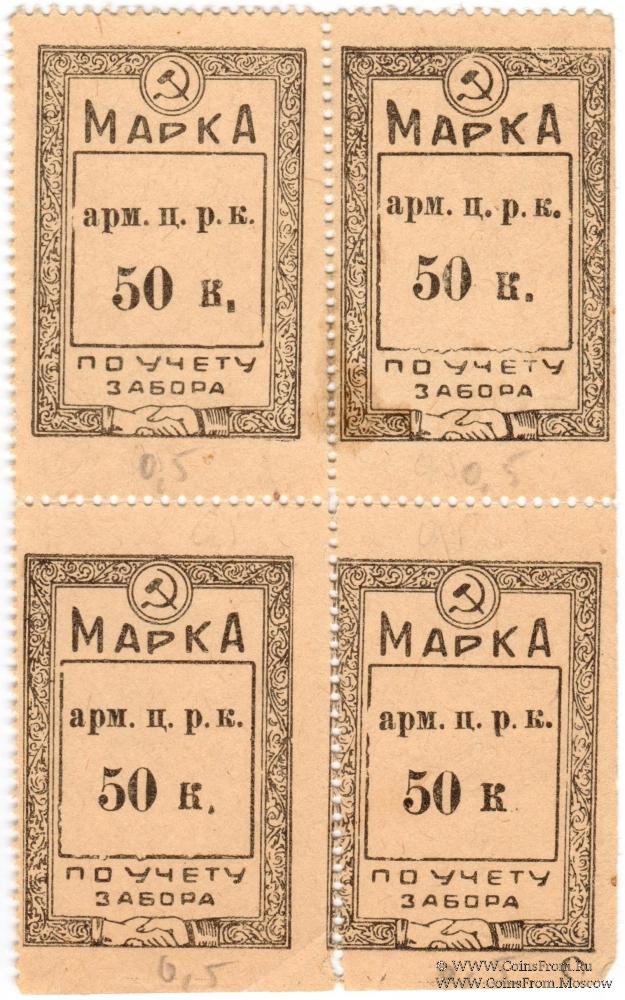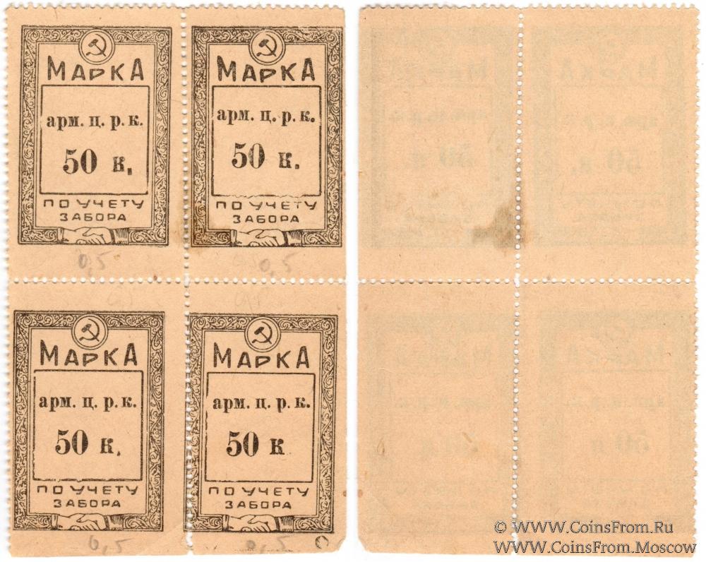 Марка без даты. Квартблок. Разные точки у буквы "К.". Арм. Ц.Р.К. (Армавирский Центральный Рабочий Кооператив).