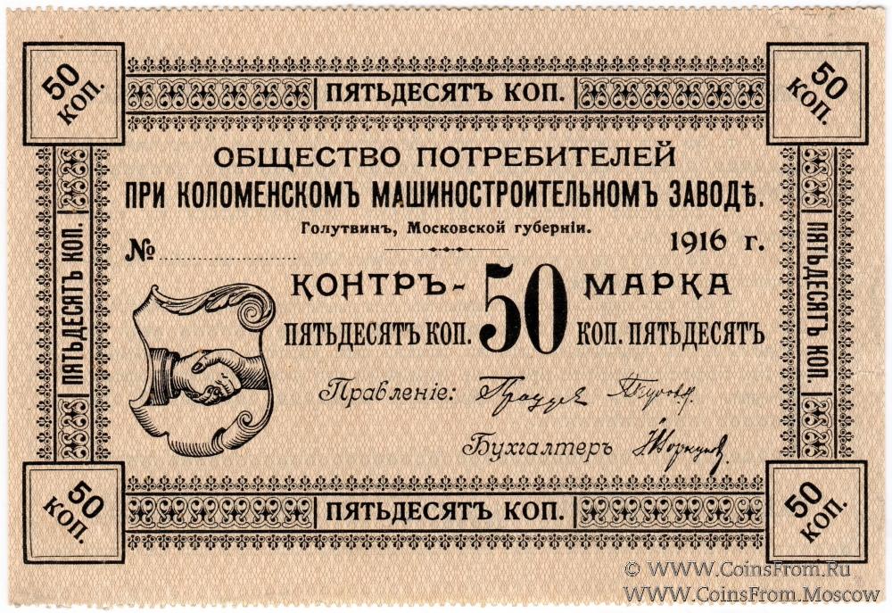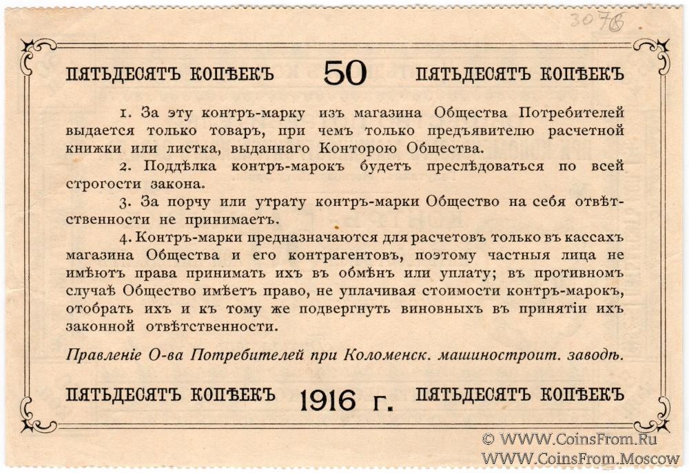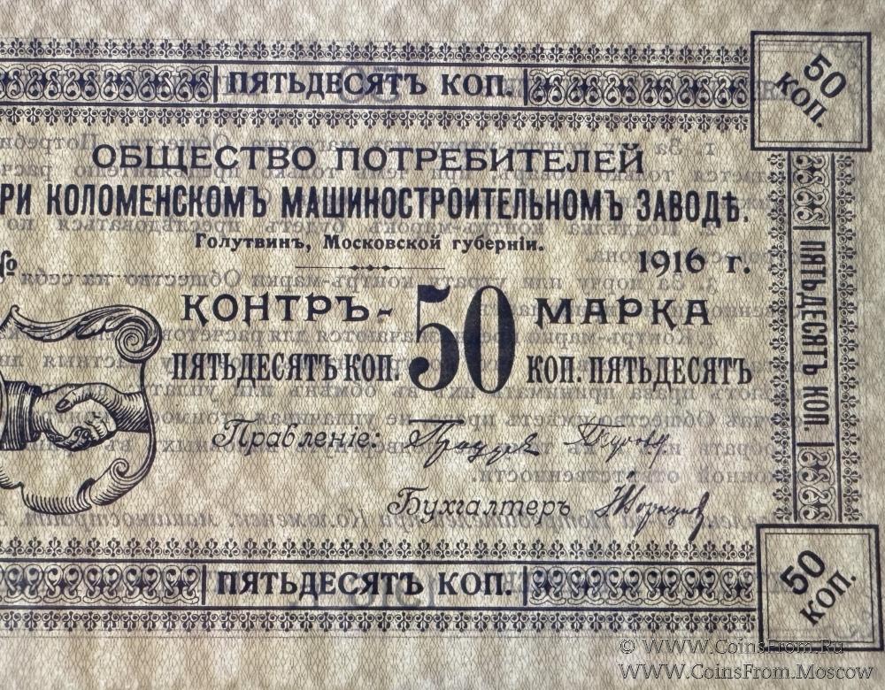 Контрольная марка 1916 г. Без серии, без номера. Водяной знак - "мозайка". Общество потребителей при Коломенском машиностроительном заводе (ОПКМЗ).