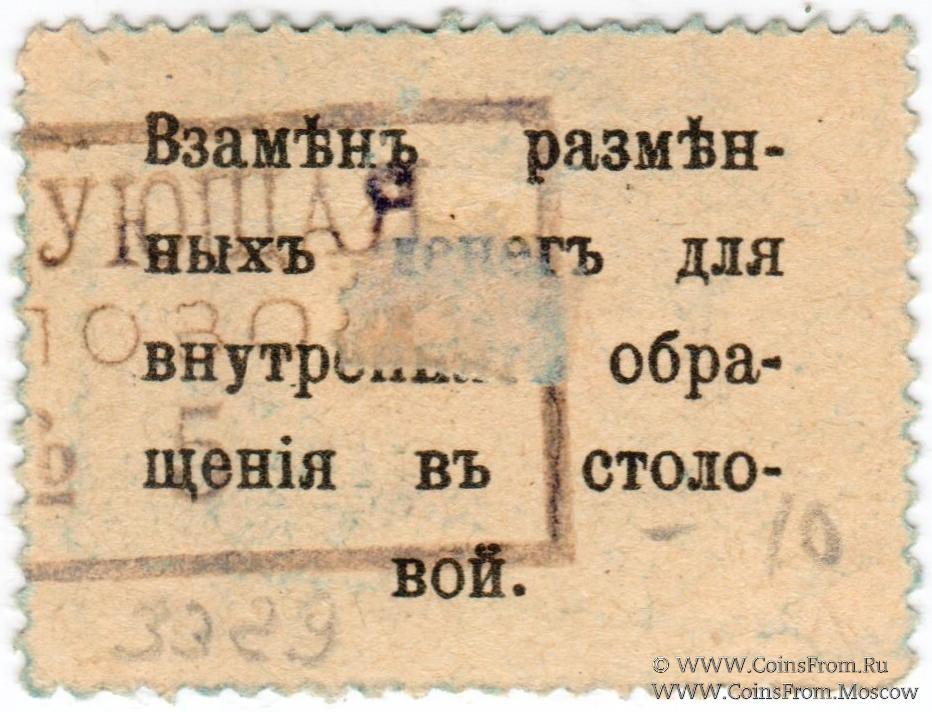 Расчетная марка без даты (1918 г.). Прямоугольный штамп на реверсе. Столовая Служащих Центросоюза.