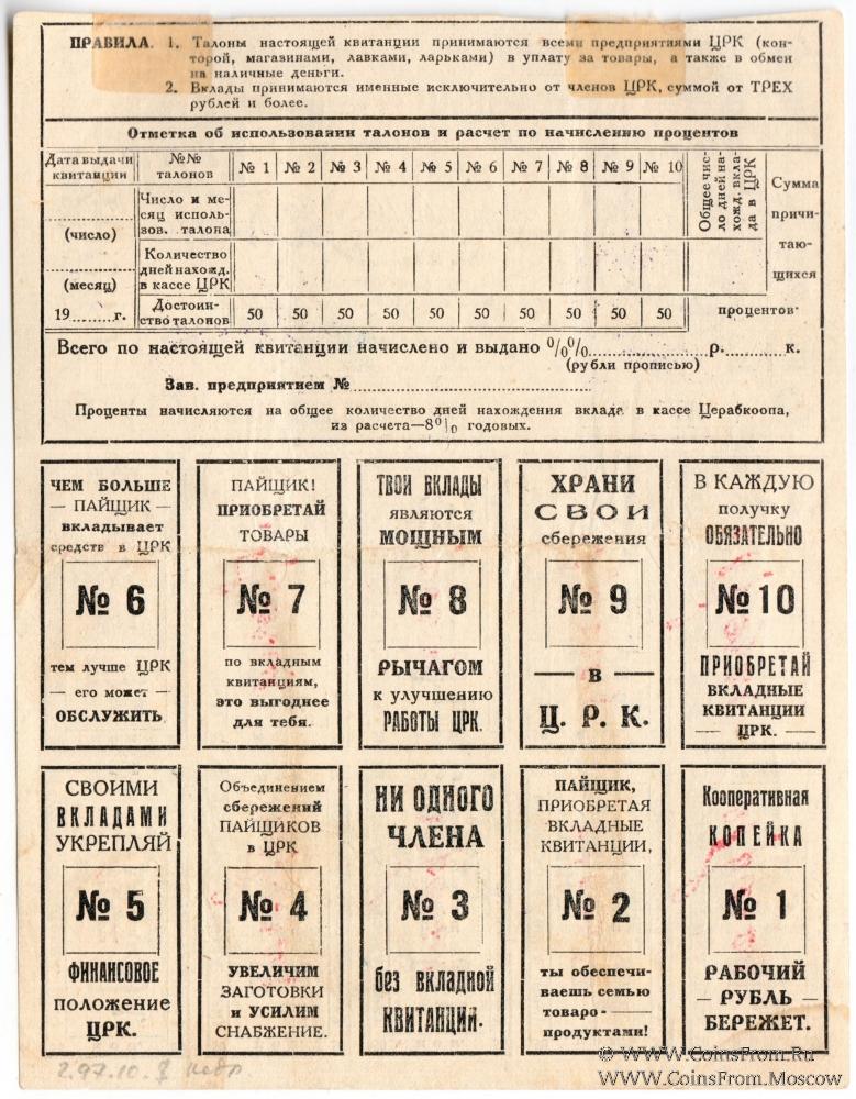 Квитанция 5 рублей без даты с 10 талонами по 50 копеек.