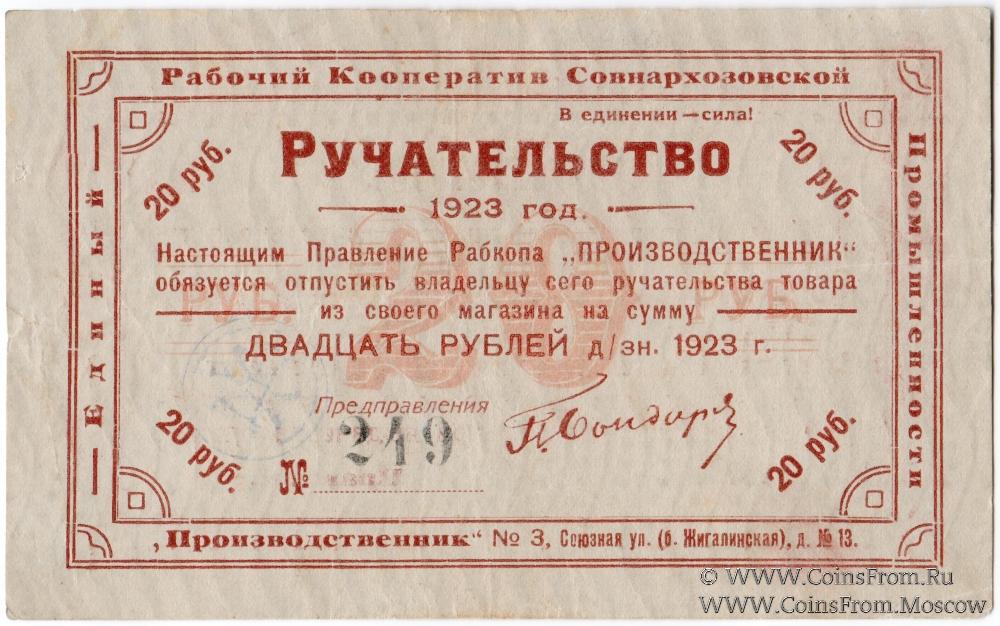Ручательство. Номер 3-значный. Единый Рабочий Кооператив Совнархозовской Промышленности "ПРОИЗВОДСТВЕННИК" № 3.