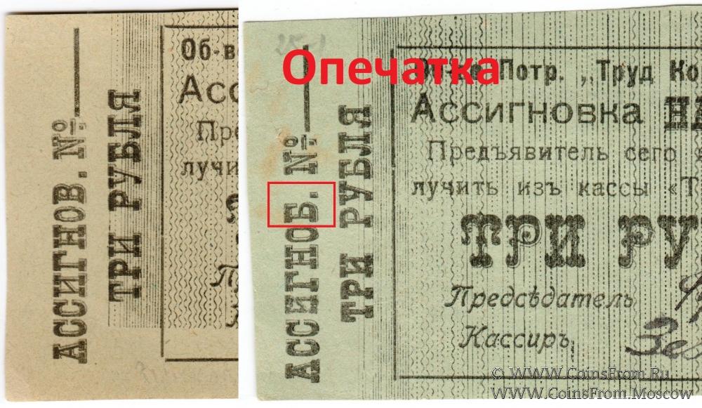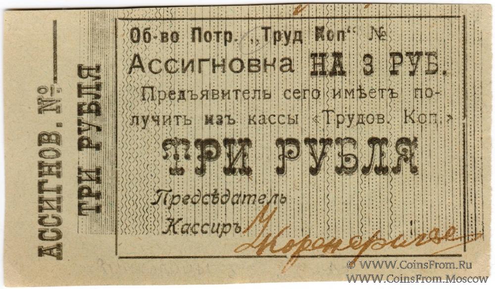 Ассигновка без даты. В тексте без опечатки "АССИГНОВ". Потребительское Общество "Трудовая копейка".