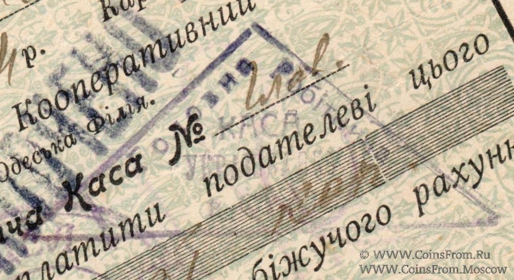Треугольный штамп (Главная Рабочая КАССА УКРАИНБАНКА) в Одессе): "Головна / Робiтнича" (по сторонам) / "КАСА / УКРАIНБАНКУ / в Одесi" (по центру в три строки)
