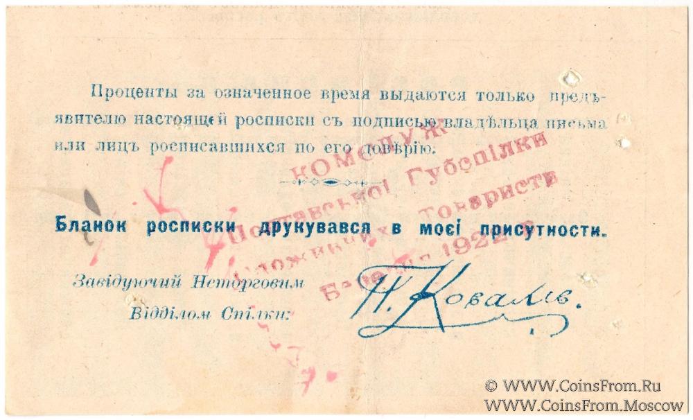 Штамп в четыре строки: "КОМСЛУЖ / Полтавськоi Губспiлки / Споживчих Товариств / Березня 1922 р".