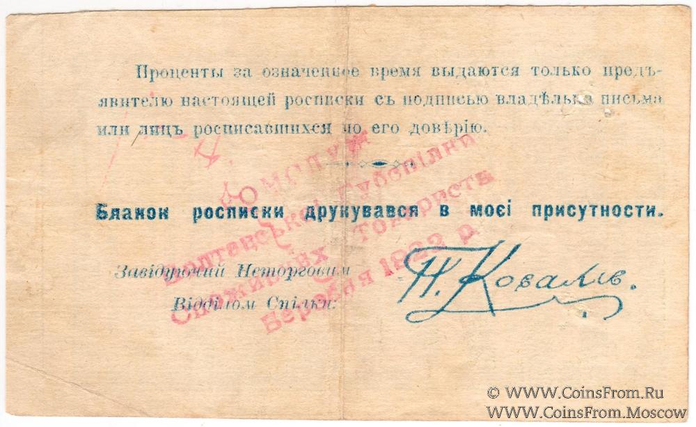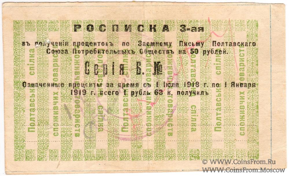 3-я Расписка (Росписка) 1919 (1922) г. Серия Б. На аверсе номер и сумма прописью (2.000.000) от руки, печать фиолетовая, подпись красная. На реверсе штамп 1922 г., текст синий. Полтавский Союз Потребительских Обществ (Полтавська спiлка споживчих товариств).