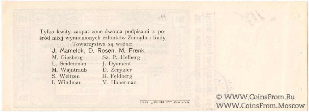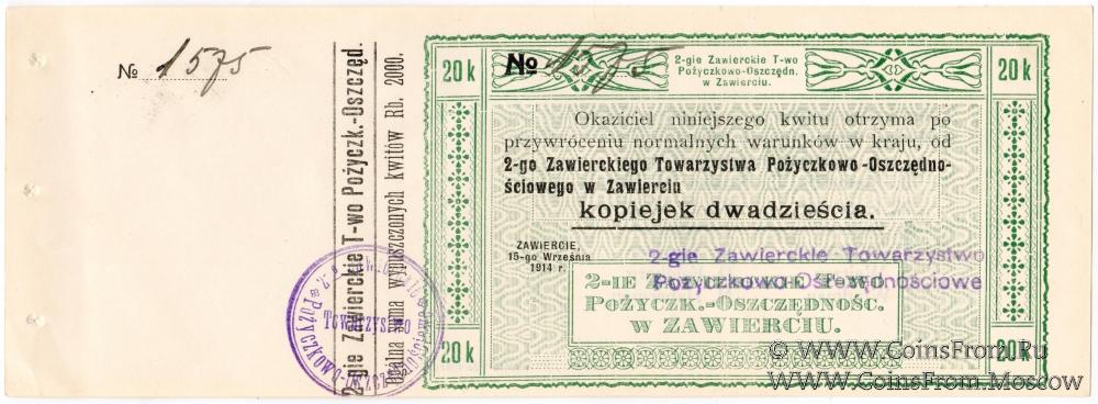 Выпуск квитанций 1914 г. 2-е Заверцкое кредитно-сберегательное общество в Заверце. Типография - Drukarnia "MERKURY' Zawiercie.