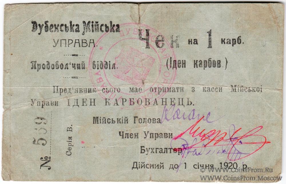 Чек 1919 г. Действителен до 1 января 1920 г. (Дiйсний до 1 сiчня 1920 р.). Серия В.