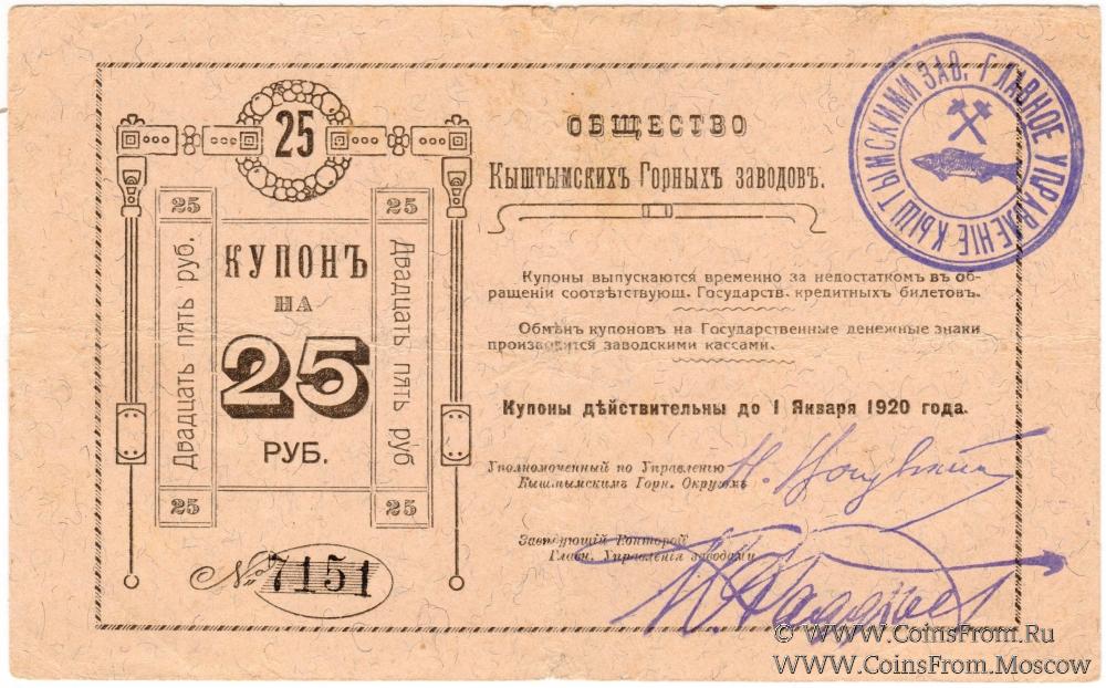 Купон без даты (1919 г.). 2-й выпуск. Действителен до 1 января 1920 г. Номер 4-значный. Общество Кыштымских Горных Заводов.