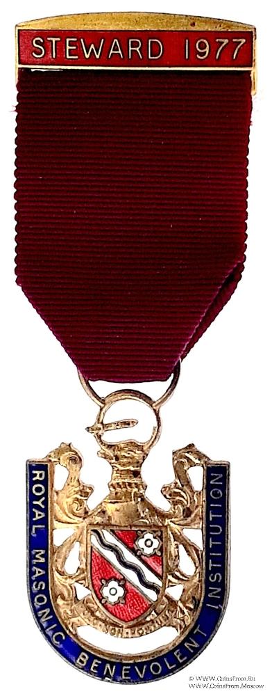 АВЕРС: лента в форме перевёрнутой арки с наименованием благотворительного заведения – Royal Masonic Benevolent Institution. В центре герб, состоящий из щита с символикой мантии, шлема, клейнода или нашлемника, размещённого на шлеме через бурелет.