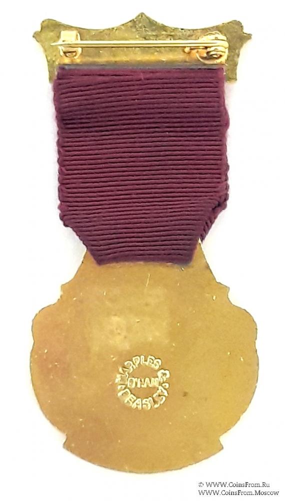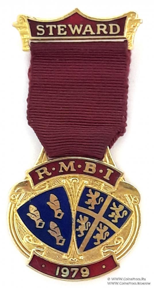Знак овальной формы сверху и снизу ленты красной эмали с надписью RMBI и датой 1979. В центре знака два малых герба в виде щитов. На одном 3 ладони, другой щит разделён четверочастно и в каждой части лев.