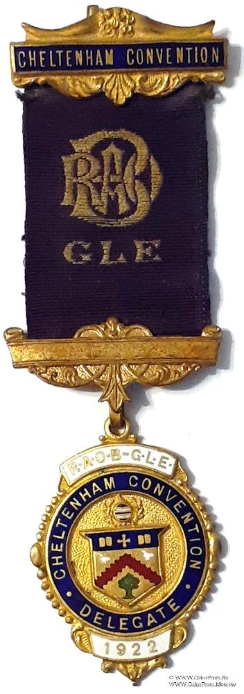 Колодки/медальон: верхняя колодка  в виде прямоугольника. Снизу прямоугольника орнамент, сверху- рога буйвола. На прямоугольнике на синей эмали надпись: CHELTENHAM CONVENNION – конвенция CHELTENHAM (Че́лтнем (Курорт Челтнем; Cheltenham) — крупный курорт в граф-стве Глостершир, Англия, недалеко от Глостера и Сиренстера). Верхняя колодка с иглой для носки, нижняя – с крючком для подвески знака в форме ленты на фоне стилизованного орнамента.
