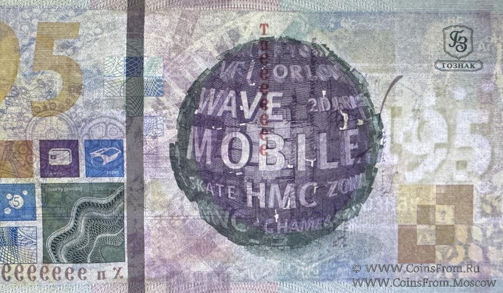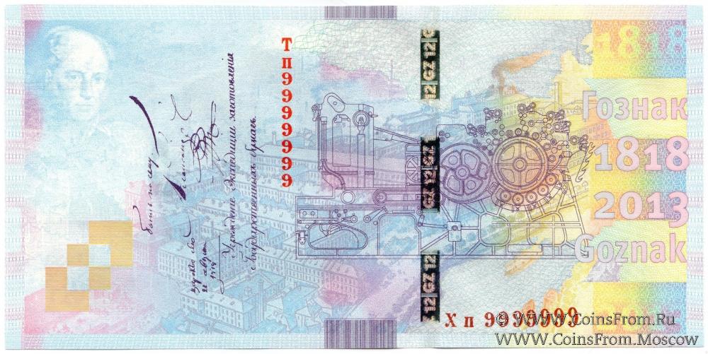 Презентационная банкнота "195 лет ГОЗНАК". БРАК нумератора: разные серии ТП (в верхнем номере), ХП (в нижнем номере). Вариант 2 (полосы). Водяной знак - "195". ГОЗНАК.