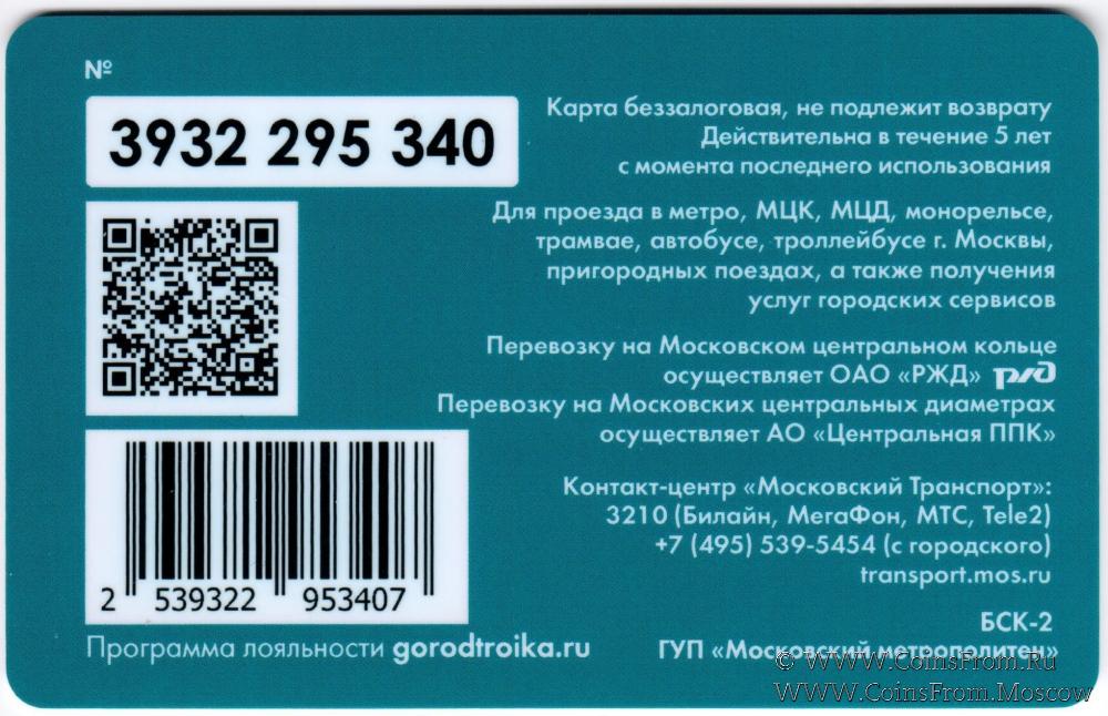 Карта подарочная (3932) беззалоговая, не подлежит возврату. Действует в течение 5 лет с момента последнего использования. Для проезда в метро, МЦК, МЦД, монорельсе, трамвае, автобусе, троллейбусе г. Москвы, пригородных поездах, а также получения услуг городских сервисов.