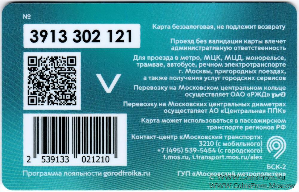 Карта сувенирная (3913) беззалоговая, не подлежит возврату. Проезд без валидации карты влечет административную ответственность. Для проезда в метро, МЦК, МЦД, трамвае, автобусе, речном электротранспорте г. Москвы, пригородных поездах, а также получения услуг городских сервисов.