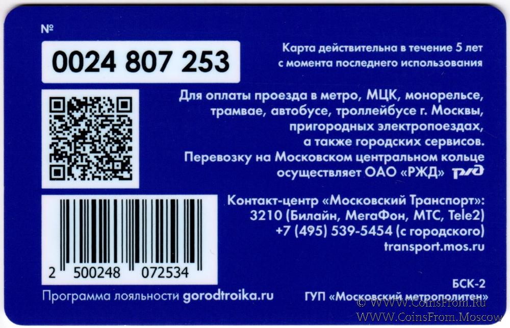 Карта залоговая (0024), действительна в течение 5 лет с момента последнего использования. Для оплаты проезда в метро, МЦК, монорельсе, трамвае, автобусе, троллейбусе г. Москвы, пригородных электропоездах, а также городских сервисов.