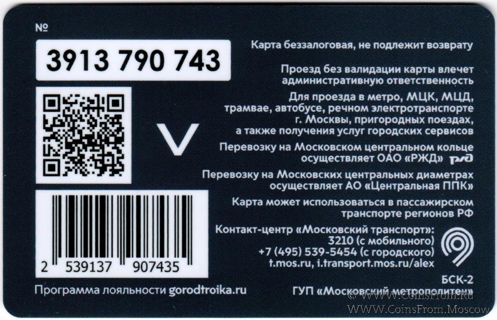Карта сувенирная (3913) беззалоговая, не подлежит возврату. Проезд без валидации карты влечет административную ответственность. Для проезда в метро, МЦК, МЦД, трамвае, автобусе, речном электротранспорте г. Москвы, пригородных поездах, а также получения услуг городских сервисов.