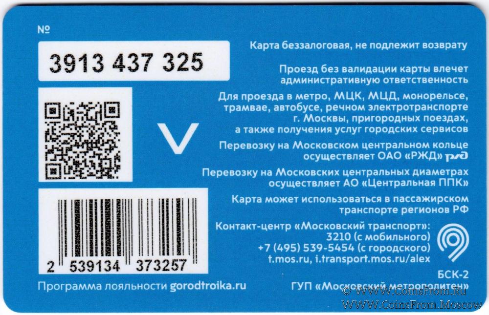 Карта сувенирная (3913) беззалоговая, не подлежит возврату. Проезд без валидации карты влечет административную ответственность. Для проезда в метро, МЦК, МЦД, монорельсе, трамвае, автобусе, речном электротранспорте г. Москвы, пригородных поездах, а также получения услуг городских сервисов.