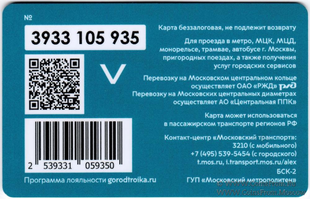 Карта беззалоговая (3933), не подлежит возврату. Для проезда в метро, МЦК, МЦД, монорельсе, трамвае, автобусе г. Москвы, пригородных поездах, а также получения услуг городских сервисов.