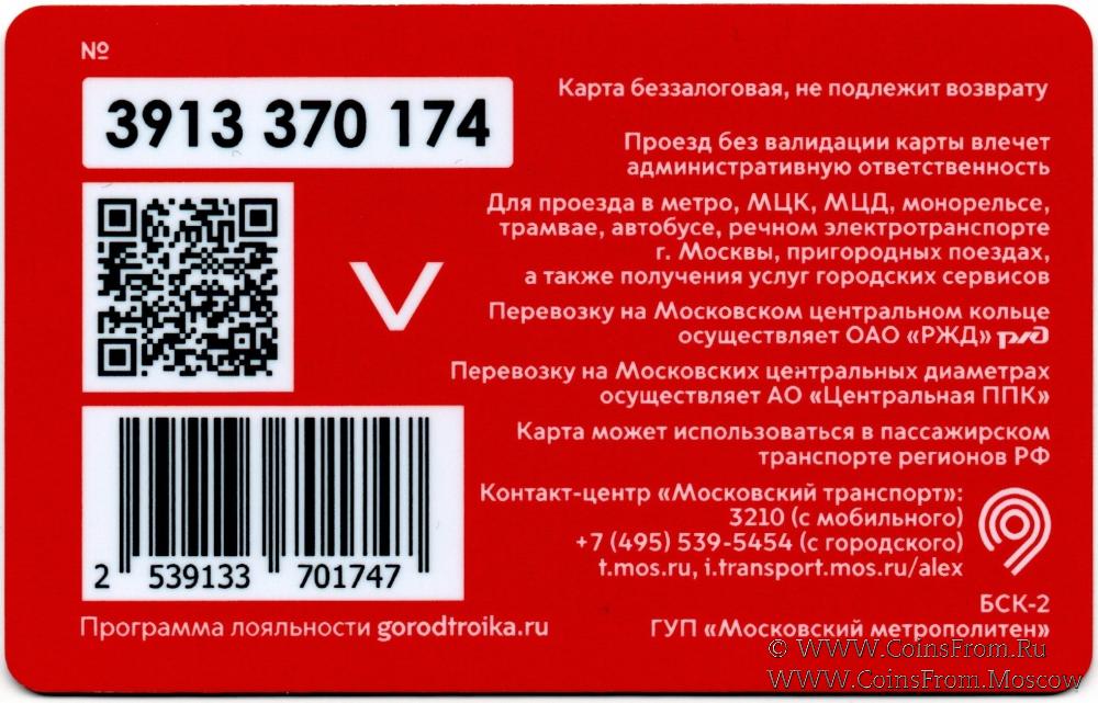Карта сувенирная (3913) беззалоговая, не подлежит возврату. Проезд без валидации карты влечет административную ответственность. Для проезда в метро, МЦК, МЦД, монорельсе, трамвае, автобусе, речном электротранспорте г. Москвы, пригородных поездах, а также получения услуг городских сервисов.