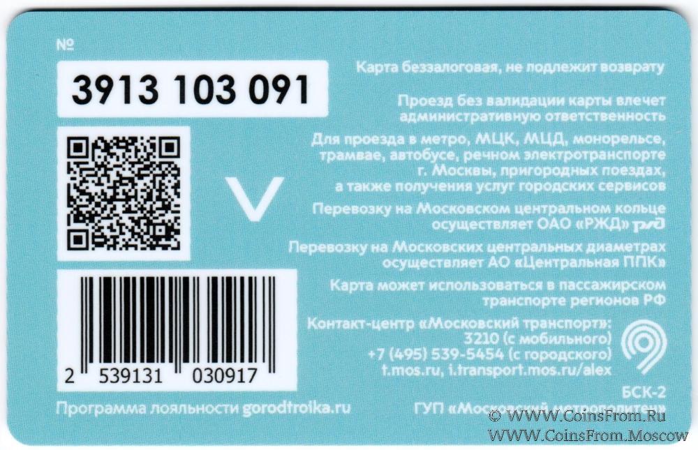 Карта беззалоговая (№ 3913), не подлежит возврату. Проезд без валидации карты влечет административную ответственность. Для проезда в метро, МЦК, МЦД, монорельсе, трамвае, автобусе г. Москвы, пригородных поездах, а также получения услуг городских сервисов.