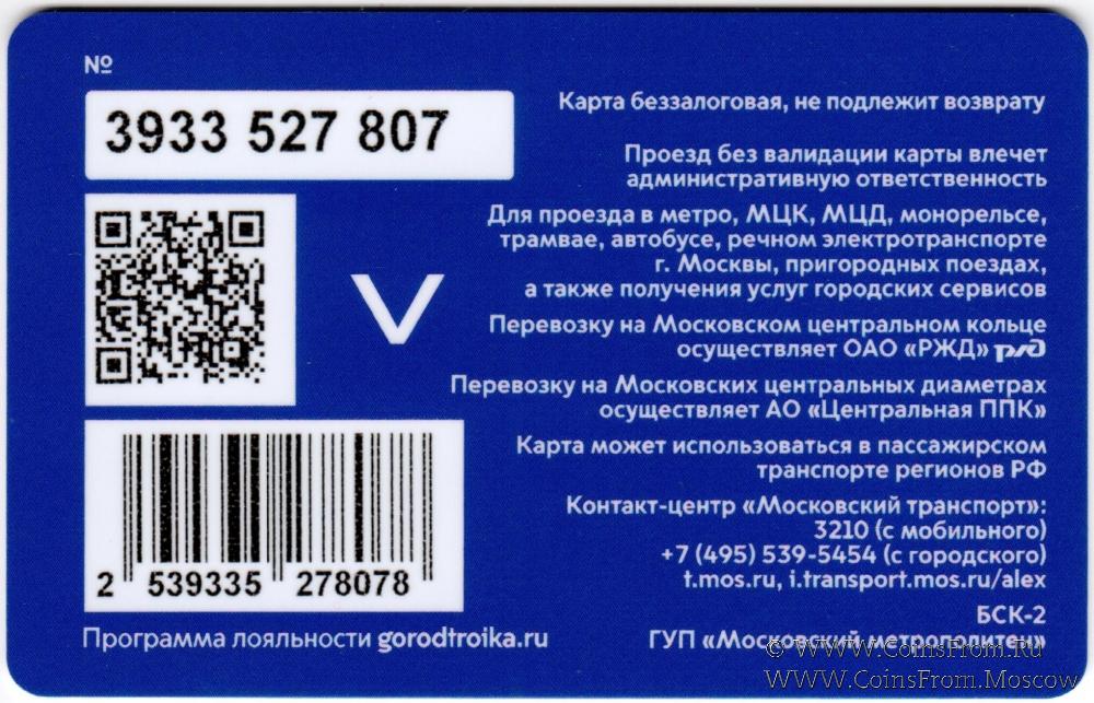 Карта подарочная (3933) беззалоговая, не подлежит возврату. Проезд без валидации карты влечет административную ответственность. Для проезда в метро, МЦК, МЦД, монорельсе, трамвае, автобусе, речном электротранспорте г. Москвы, пригородных поездах, а также получения услуг городских сервисов.