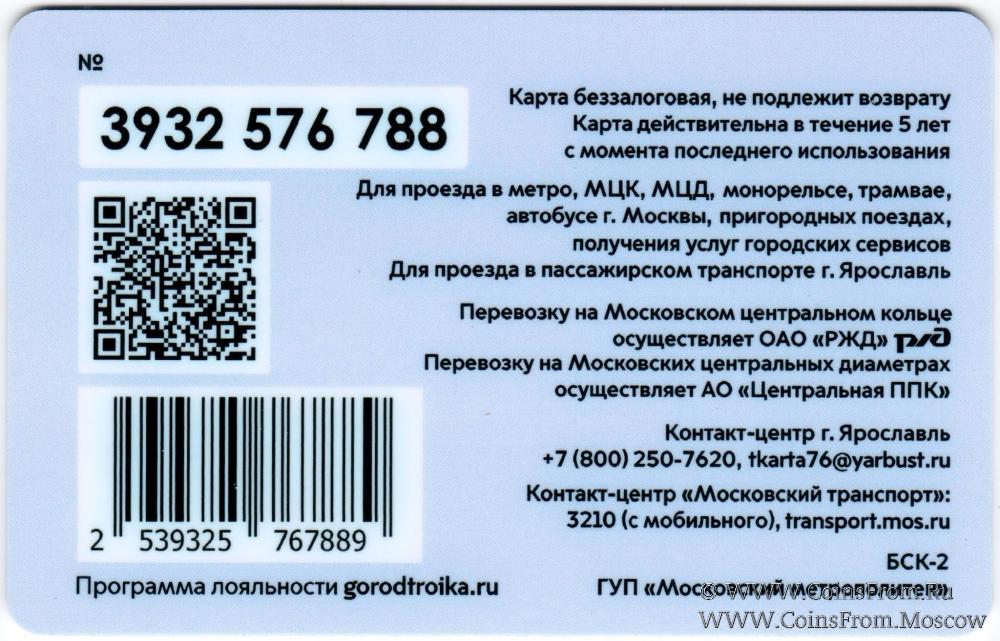 Карта беззалоговая (3932), не подлежит возврату. Карта действительна в течение 5 лет с момента последнего использования. Для проезда в метро, МЦК, МЦД, монорельсе, трамвае, автобусе г. Москвы, получения услуг городских сервисов. Для проезда в пассажирском ранспорте г. Ярославль.