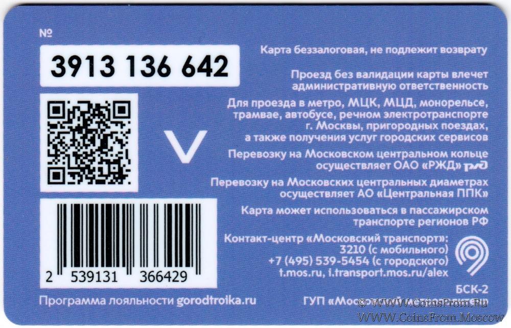 Карта беззалоговая (3913), не подлежит возврату. Проезд без валидации карты влечет административную ответственность. Для проезда в метро, МЦК, МЦД, монорельсе, трамвае, автобусе, речном электротранспоре г. Москвы, пригородных поездах, а также получения услуг городских сервисов.