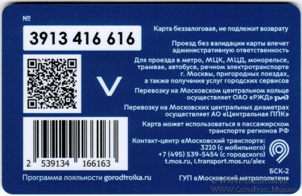 Карта сувенирная (3913) беззалоговая, не подлежит возврату. Проезд без валидации карты влечет административную ответственность. Для проезда в метро, МЦК, МЦД, трамвае, автобусе, речном электротранспорте г. Москвы, пригородных поездах, а также получения услуг городских сервисов.