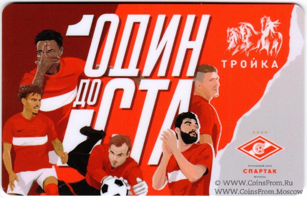 Электронная транспортная карта "Тройка". Размер: 85,5 * 54 мм. Карта выпущена в рамках промо-кампании "Один до ста", посвящённой 100-летию московского футбольного клуба "Спартак", который должен отмечаться в апреле 2022 года.