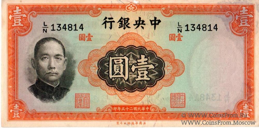 Выпуск 1936 г. Центральный Банк Китая (The Central Bank of China, 行銀央中). Типография: W&S (WATERLOW & SONS LIMITED, LONDON)
