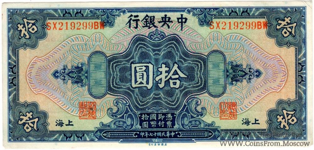 Выпуск 1928 г. Серия из 4-х литер (ХХ № ХХ). Номер на аверсе и реверсе. Подписи черные. Центральный Банк Китая (The Central Bank of China / 行銀央中). Шанхай (Shanghai).
