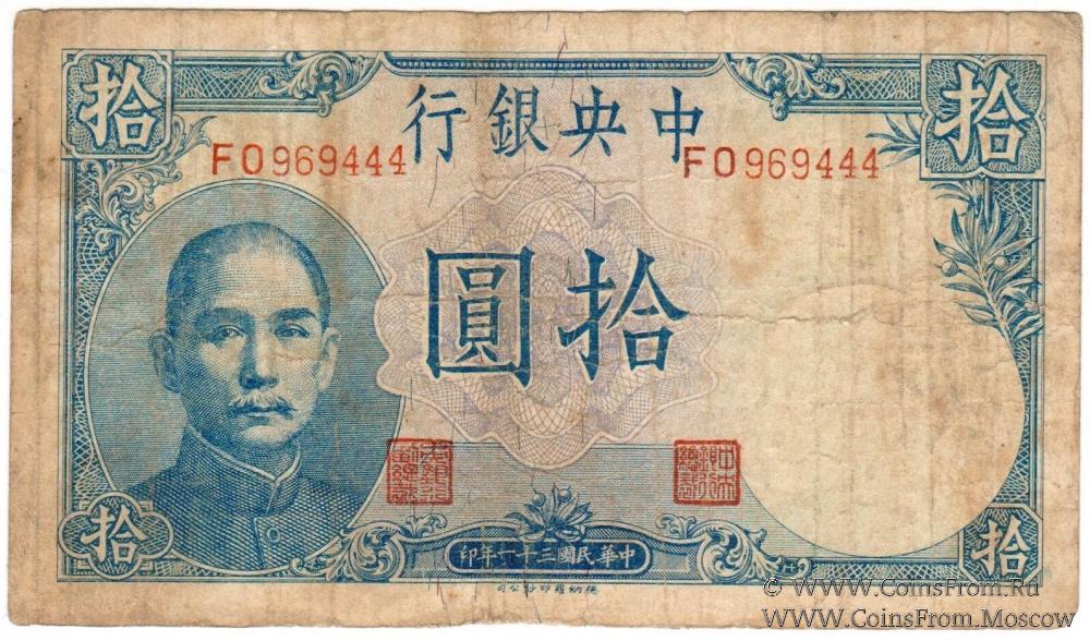 Выпуск 1942 г. Вариант подписи Управляющего (1). Центральный Банк Китая (The Central Bank of China, 行銀央中). TDLR (THOMAS DE LA RUE & COMPANY LIMITED LONDON).