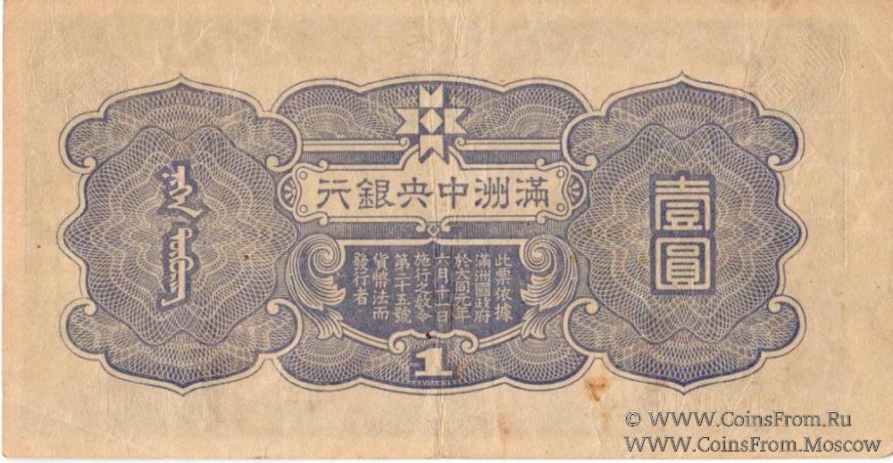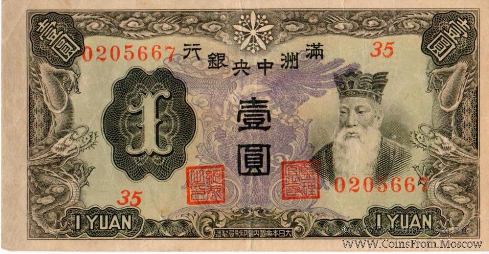 Выпуск 1944 г. Серия и номер. Центральный банк Маньчжоу-го (Central Bank of Manchukuo / 滿洲中央銀行).