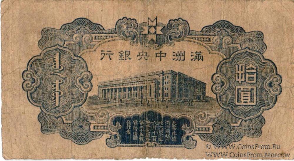 Выпуск 1944 г. Серия и номер. Центральный банк Маньчжоу-го (Central Bank of Manchukuo / 滿洲中央銀行).