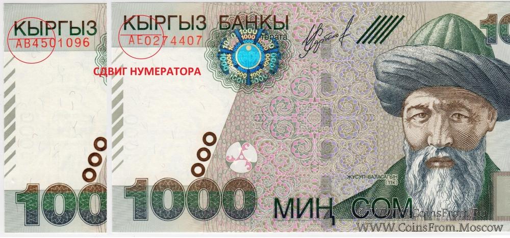 БРАК: сбой нумератора (сдвиг серии относительно номера). Выпуск 1997-2005 гг. III серия. Национальный банк Киргизской Республики.