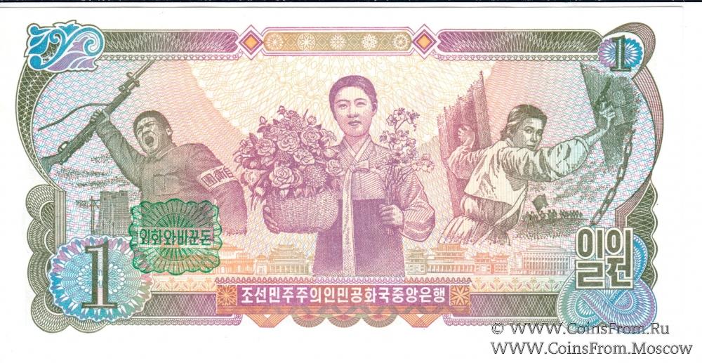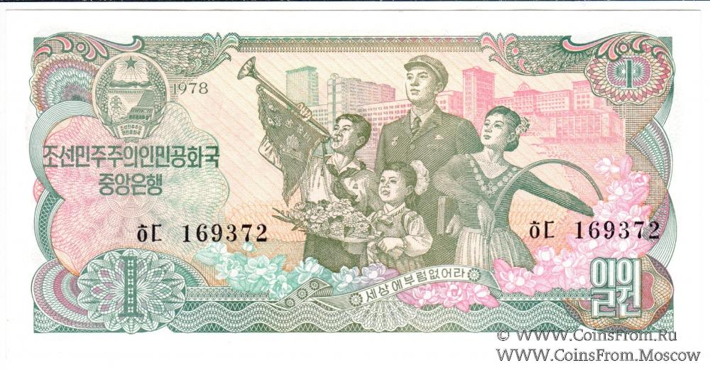 Выпуск 1978 г. Номер черный и черный, зеленая печать на реверсе. Центральный банк Корейской Народно-Демократической Республики (조선민주주의인민공화국중앙은행).