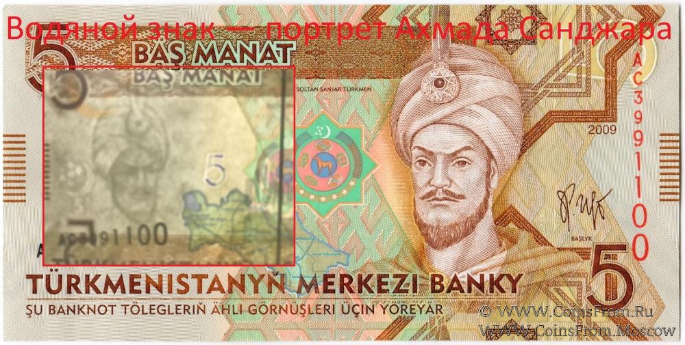 • 5 манатов — портрет Ахмада Санджара (последний султан Сельджукской империи с 1118 по 1153 год из династии Сельджукидов);