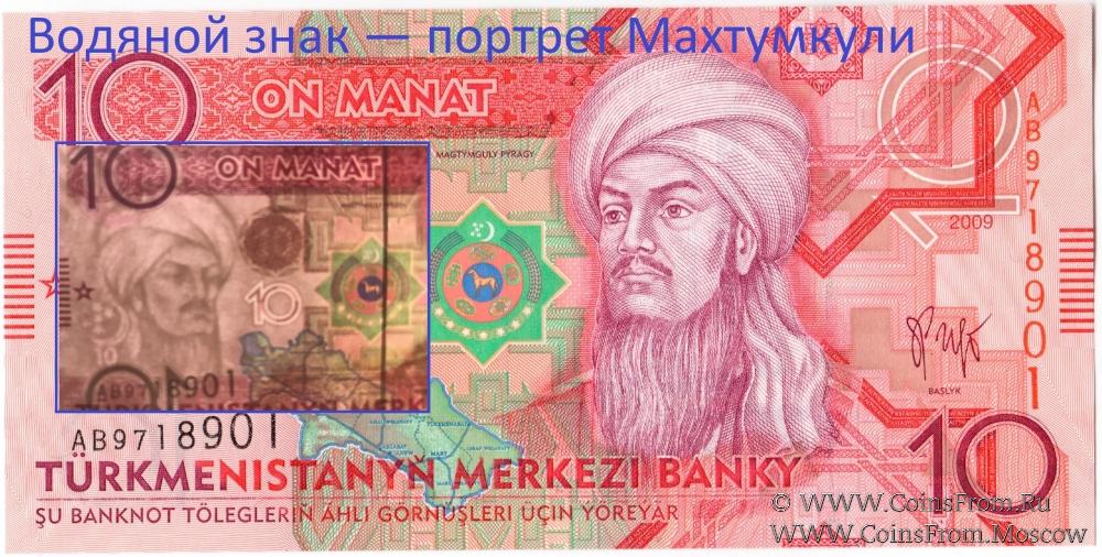 • 10 манатов — портрет Махтумкули (1724-1807) (туркменский поэт, философ, классик туркменской литературы);