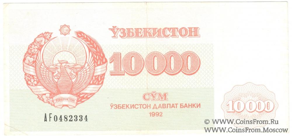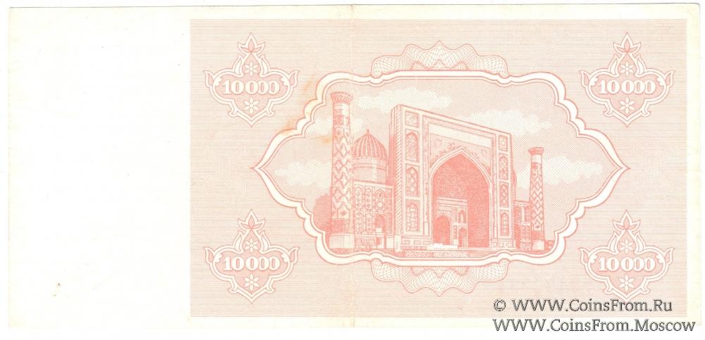 Выпуск 1992 г. Водяной знак - раскрытая коробочка хлопка. Номер высотой 3,1 мм. Государстенный банк Узбекистана (Ўзбекистон давлат банки).