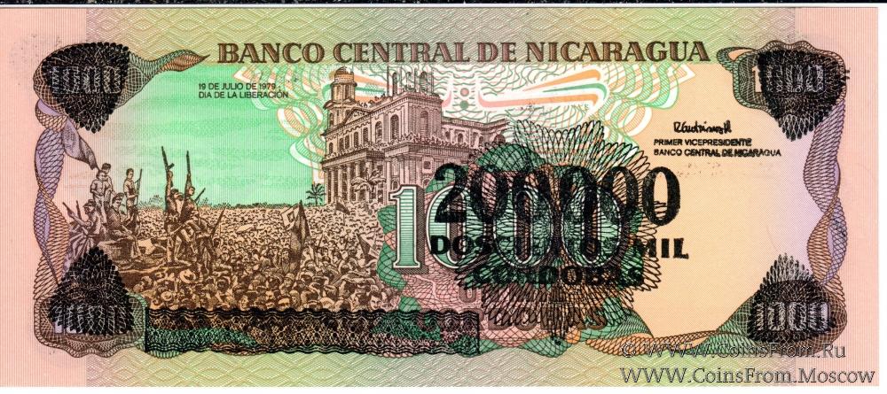 Выпуск 1990 г. Центральный банк Никарагуа (Banco Central de Nicaragua). Надпечатка (PRIMER VICE PRESIDENTE BANCO CENTRAL DE NICARAGUA).