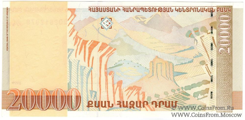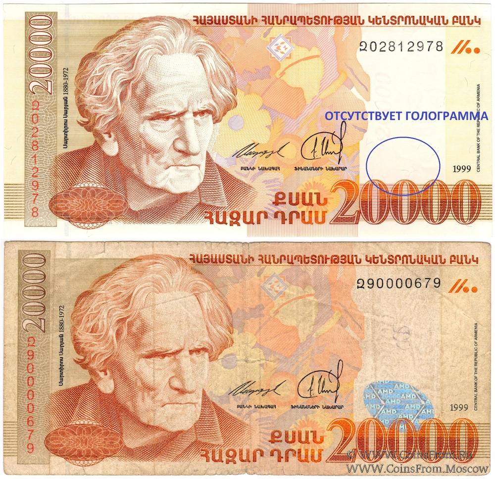 Выпуск 1999 г. БРАК: отсутствует голограмма на аверсе. Центральный Банк Республики Армения (Central Bank of the Republic of Armenia).
