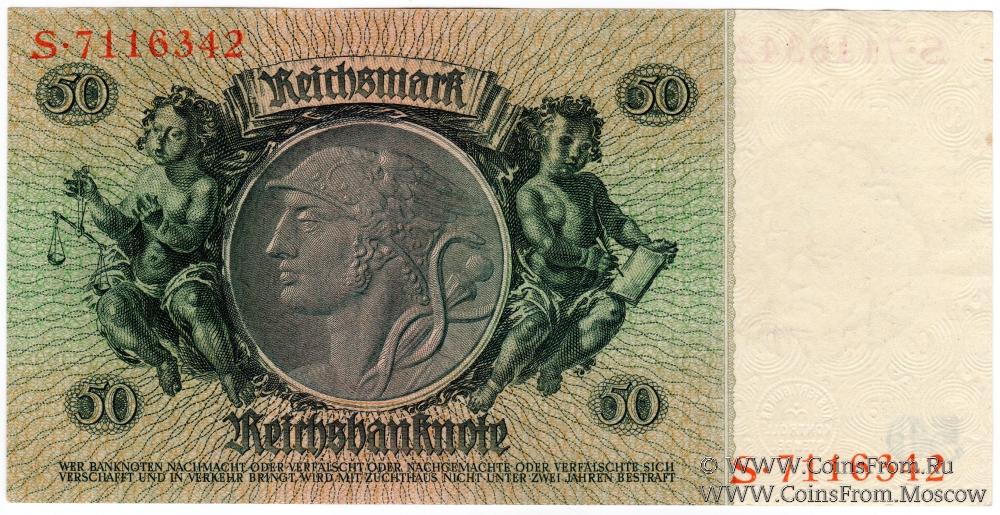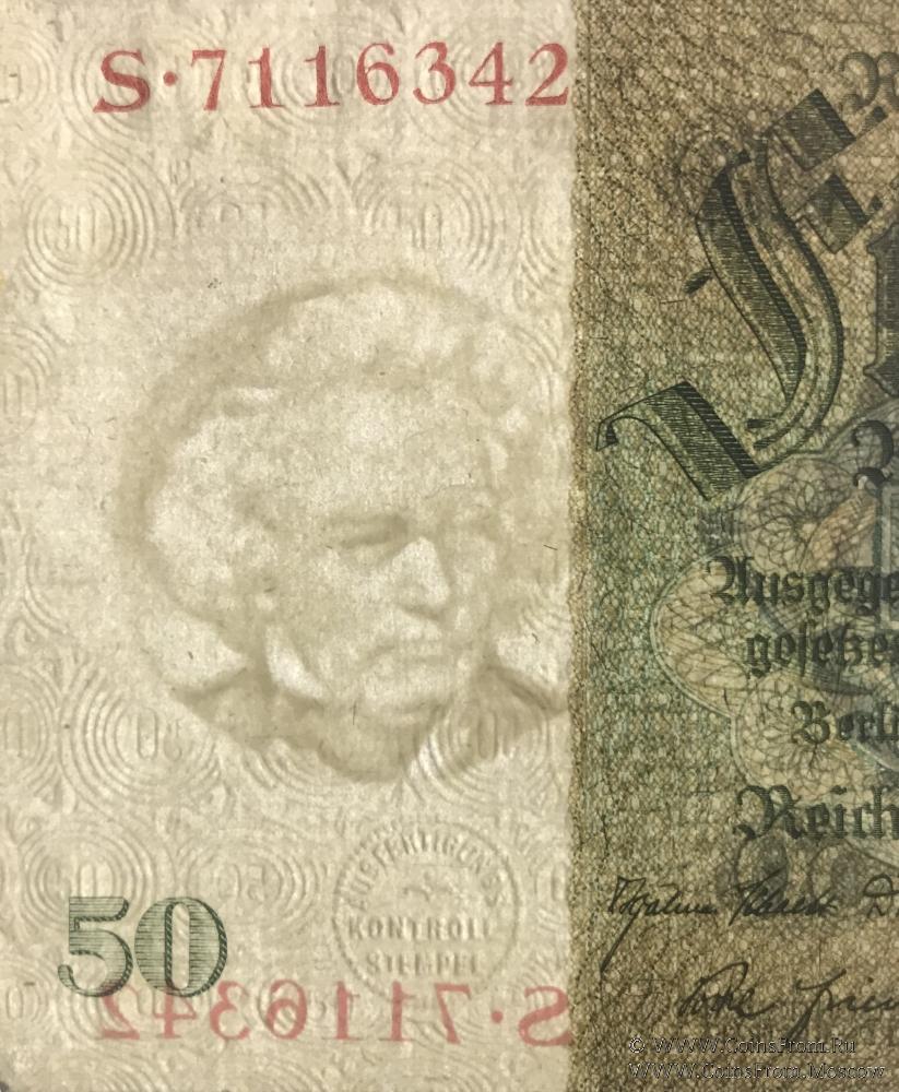 Две литеры: D (на фоновой сетке) и S (в номере). Номер 7-значный. Выпуск 1929-1936 гг. Рейхсбанкноты (Reichsbanknote) образца 1933 г. Рейхсбанк (Reichsbank).