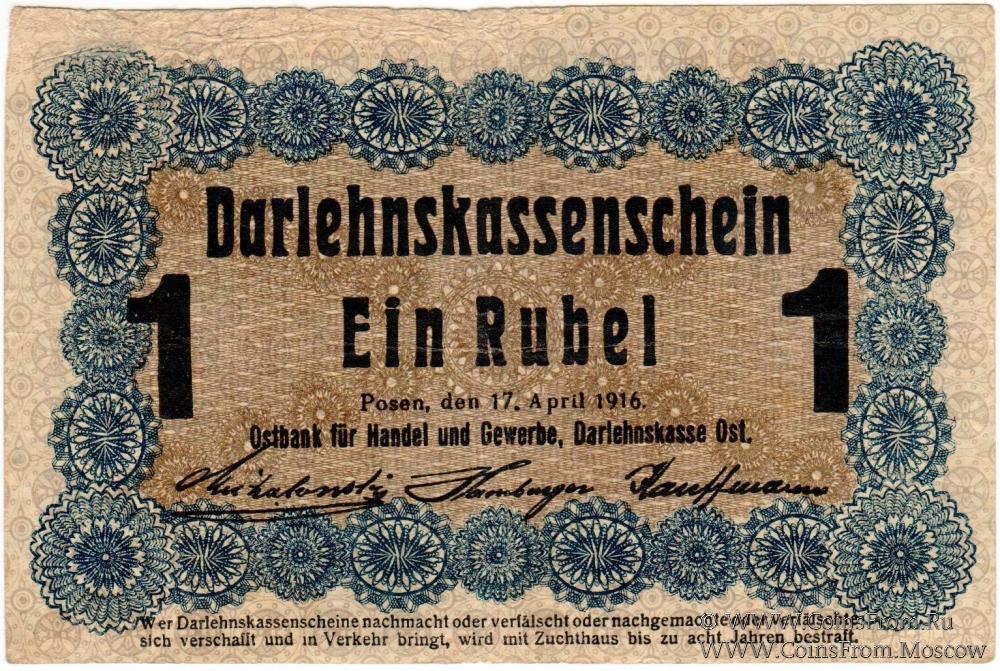 Выпуск 1916 г. в ост-рублях. Ссудные кассовые знаки Восточного банка для торговли и промышленности. Познань. (Ostbank für Handel und Gewerbe, Darlehnskasse OST / Darlehnskassenschein. Posen, den 17. April 1916).