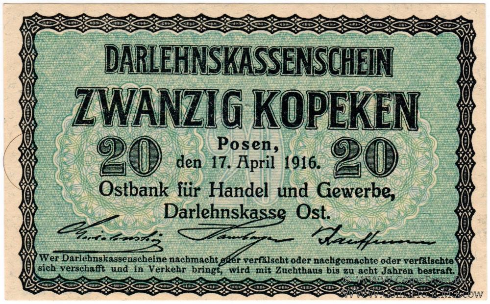 (Ostbank für Handel und Gewerbe, Darlehnskasse OST / Darlehnskassenschein. Posen, den 17. April 1916).