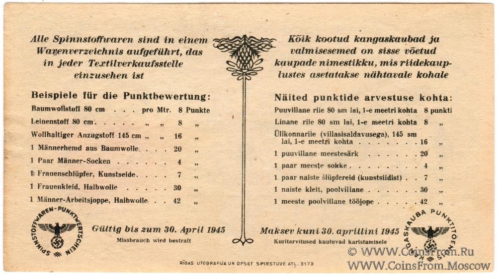 Без номера. RLuOSa (RIGAS LITOGRSFIJA UN OFSET SPIESTUVE ATL. 3173). Текстильные талоны. Reichskommissariat OSTLAND.