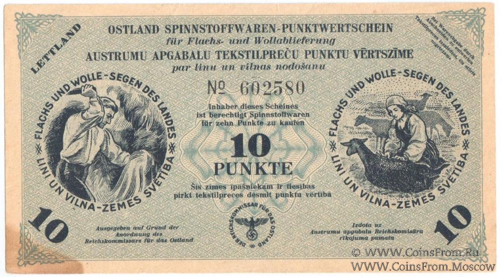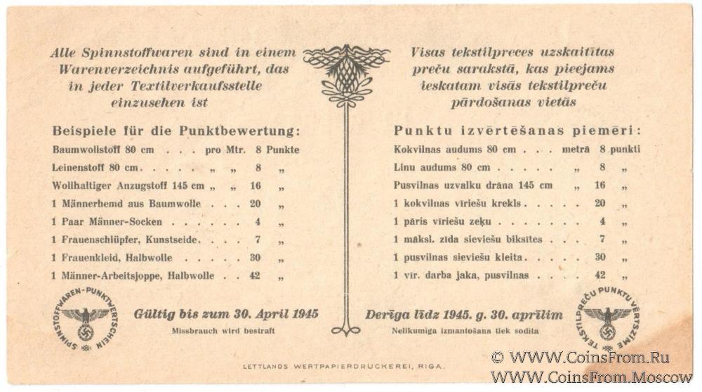 Текстильные талоны. Reichskommissariat OSTLAND. Номер 6-значный. LWR (LETTLANDS WERTPAPIERDRUCKEREI, RIGA).